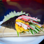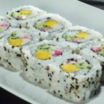 Kani, Manga, Pepino e Arroz Japonês na Alga Crocante. Leve, Refrescante e Cheio de Sabor! Acompanha 2 Shoyus e 1 Tarê.