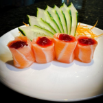 5 Unidades de Salmão com Calda de Abacaxi. Refrescante, Tropical e Irresistível! Acompanha 1 Hashi, 2 Sachês de Shoyu e 1 de Tarê.