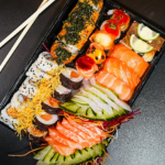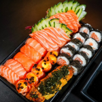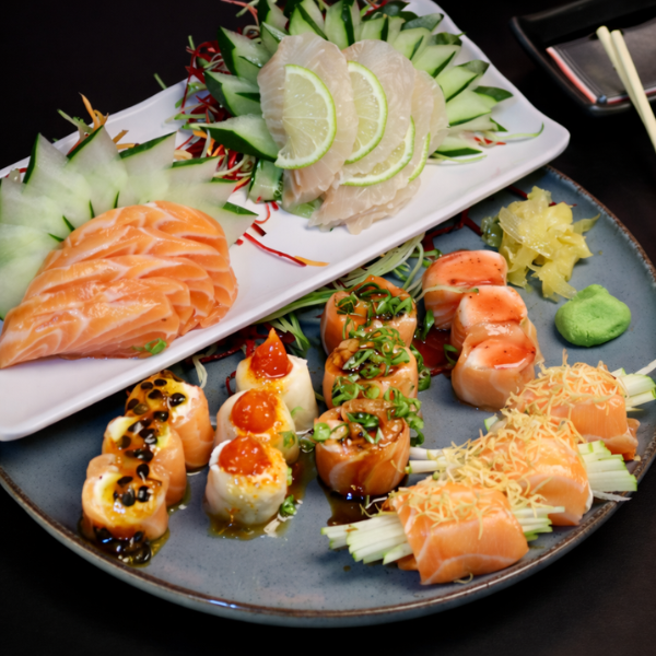 5 Sashimis de Salmão, 5 de Tilápia, 3 Gunkans de Salmão com Calda de Morango, 3 com Calda de Maracujá, 3 com Maçã Verde, 3 Gunkans de Tilápia com Pimenta Biquinho e 3 Gunkans de Salmão Shake Sem Arroz, com Patê de Salmão. Leve, Proteico e Cheio de Sabor!