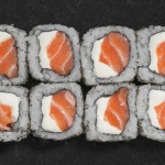 Salmão com Cream Cheese Enrolado no Arroz Japonês e Alga. Suave, Cremoso e Clássico! Acompanha 1 Hashi, 3 Shoyus e 1 Tarê.