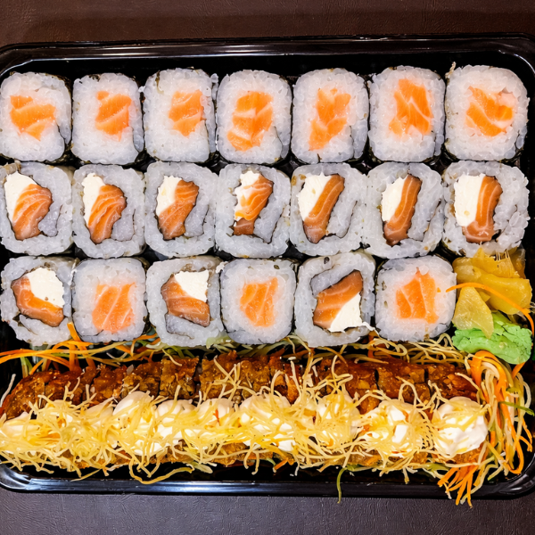 5 Hot Philadelphia, 2 Niguiris Skin, 2 Niguiris de Salmão, 3 Gunkans de Salmão, 2 de Tilápia, 3 Sashimis de Salmão e 3 de Tilápia. Compacto, Variado e Cheio de Sabor! Acompanha 1 Hashi, 3 Shoyus e 1 Tarê.