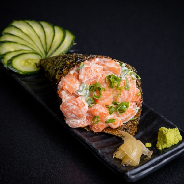 Cubos de Salmão Fresco com Cream Cheese, Cebolinha e Arroz Japonês na Alga Crocante. Clássico, Refrescante e Irresistível! Acompanha 2 Shoyus e 1 Tarê.