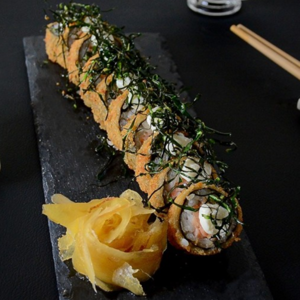 Enrolado Empanado com Salmão, Cream Cheese e Alga, Frito Até Ficar Douradinho por Fora e Cremoso por Dentro. Acompanha 1 Hashi, 3 Sachês de Shoyu e 1 Tarê.