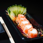 Enrolado com Salmão Fresco, Arroz Japonês e Alga por Dentro. Clássico, Suave e Irresistível! Acompanha 1 Hashi, 2 Shoyus e 1 Tarê.