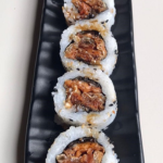 Enrolado de Camarão Empanado com Arroz Japonês e Alga Crocante. Uma Explosão de Textura e Sabor! Acompanha 1 Hashi, 2 Shoyus e 1 Tarê.