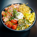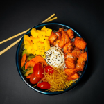 Cubos de Salmão Fresco com Tomate Cereja, Manga, Sunomono, Cream Cheese, Crispy de Batata Doce e Arroz Japonês. Frescor Tropical em Uma Combinação Leve e Irresistível!