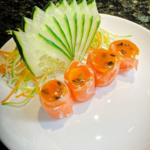 05 Unidades com Camarão Empanado, Envolto em Cream Cheese e Salmão Maçaricado. Explosão de Textura e Sabor! Acompanha 1 Hashi, 2 Shoyus e 1 Tarê.