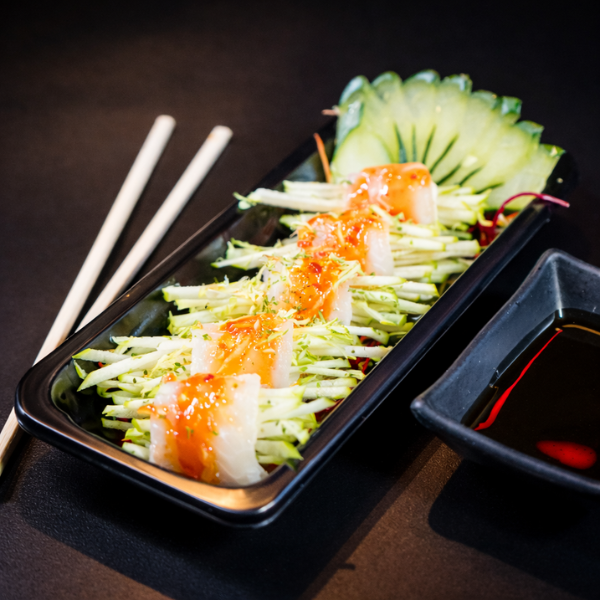 Lâminas de Tilápia Envolvendo Cream Cheese, Finalizadas com Maçã Verde, Raspas de Limão e Geleia de Pimenta. Fresco, Agridoce e Levemente Picante! Acompanha 1 Hashi, 2 Shoyus e 1 Tarê.
