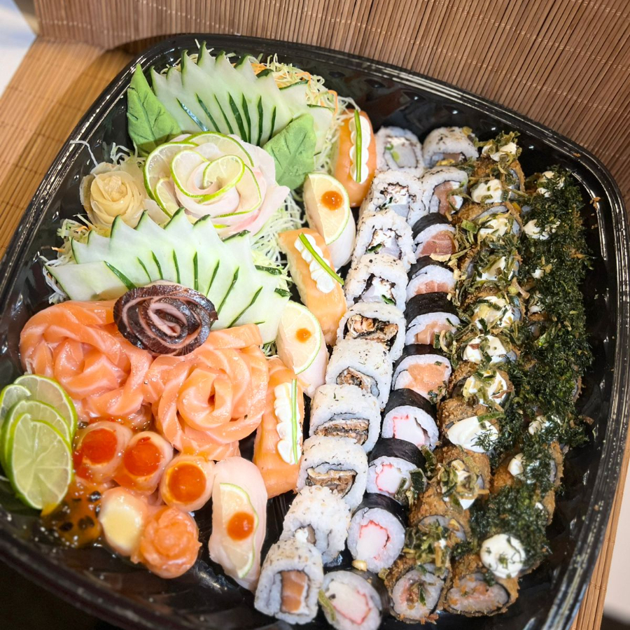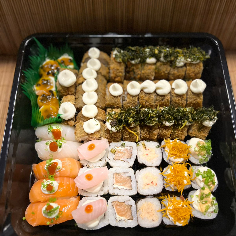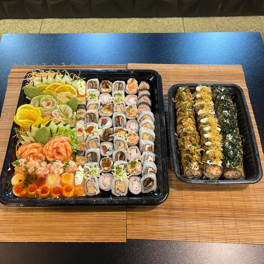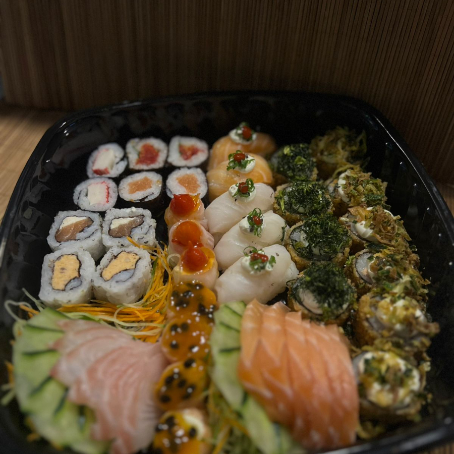 Combo 120 Peças - 10 sashimi de salmão, 10 sashimi de peixe branco, 5 gunkans de salmão, 5 gunkans com calda, 5 gunkans de peixe branco, 5 niguiris skin, 5 niguiris de salmão, 45 sushis variados