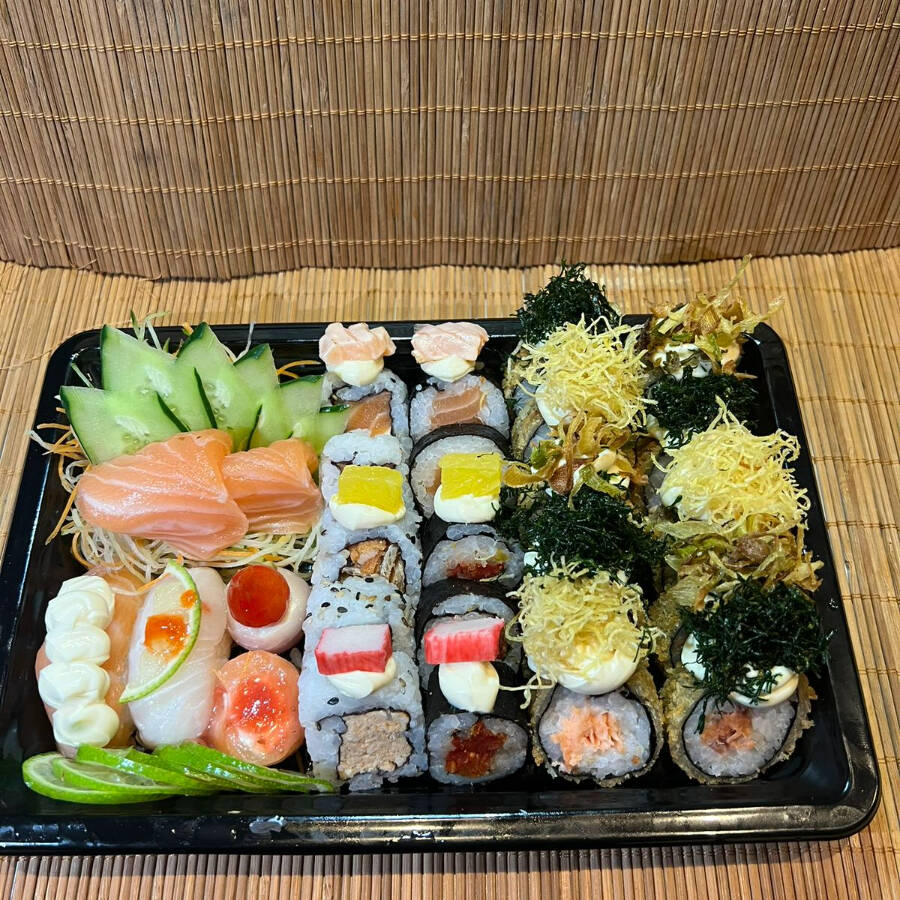 Combo 72 Peças - 10 sashimis de salmão, 10 sashimis de peixe branco, 3 niguiris de salmão, 3 niguiris de skin, 6 gunkan's, 20 hot's filadelfia, 20 sushis variados (escolha do chefe)
