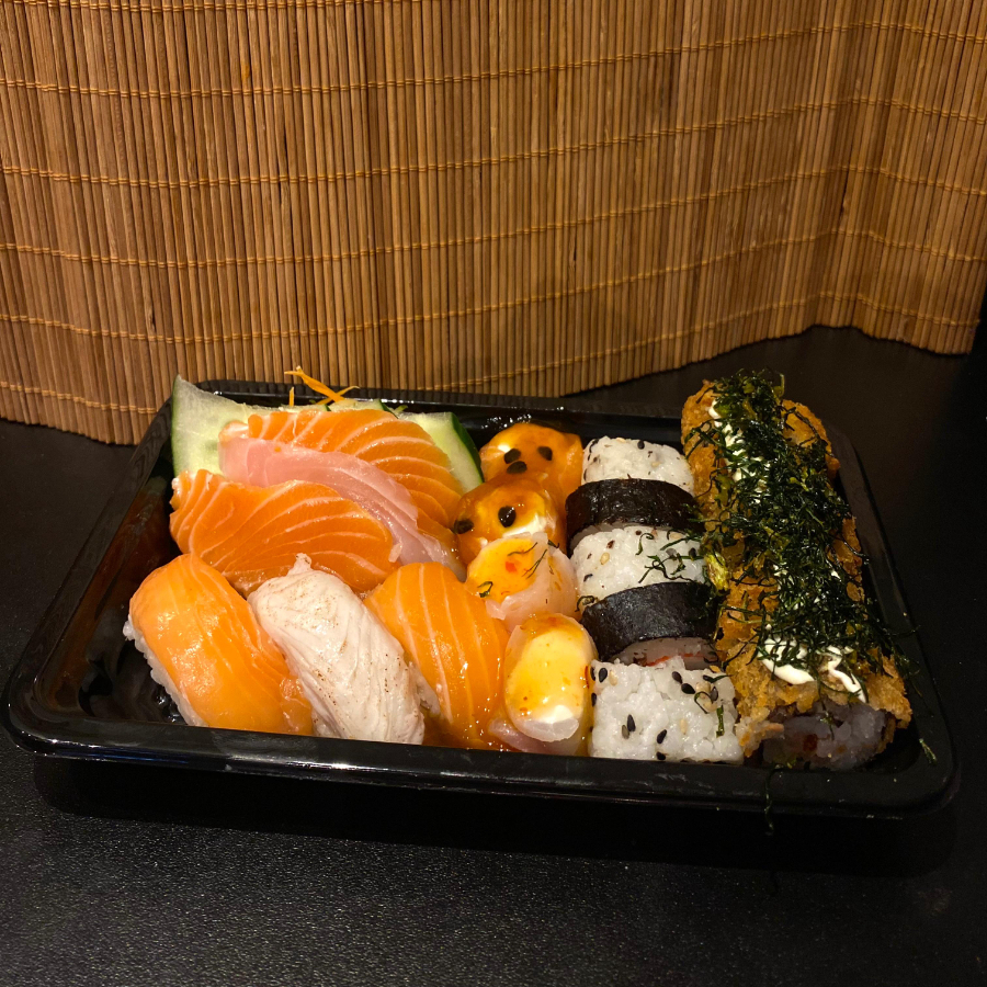 5 hot's filadelfia, 5 sushis variados (a escolha do chefe), 3 sashimis variados, 4 gunkan's variados, 3 niguirirs variados