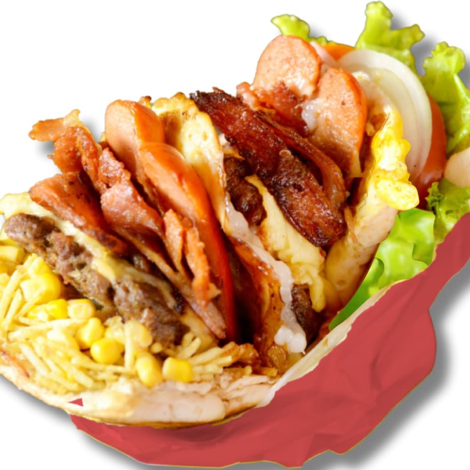 1 Sanduiche com:Pão Big, Carne Artesanal a Escolha, Bacon, 2 Salsicha,2 Ovo,Mussarela,Alface, tomate, Abacaxi,Milho e Batata. 1 Bebida a escolha 1 Batata 150g*meramente ilustrativa, vai apenas uma das bebidas acima