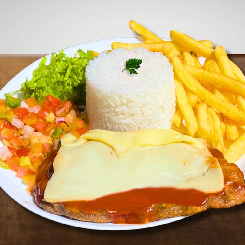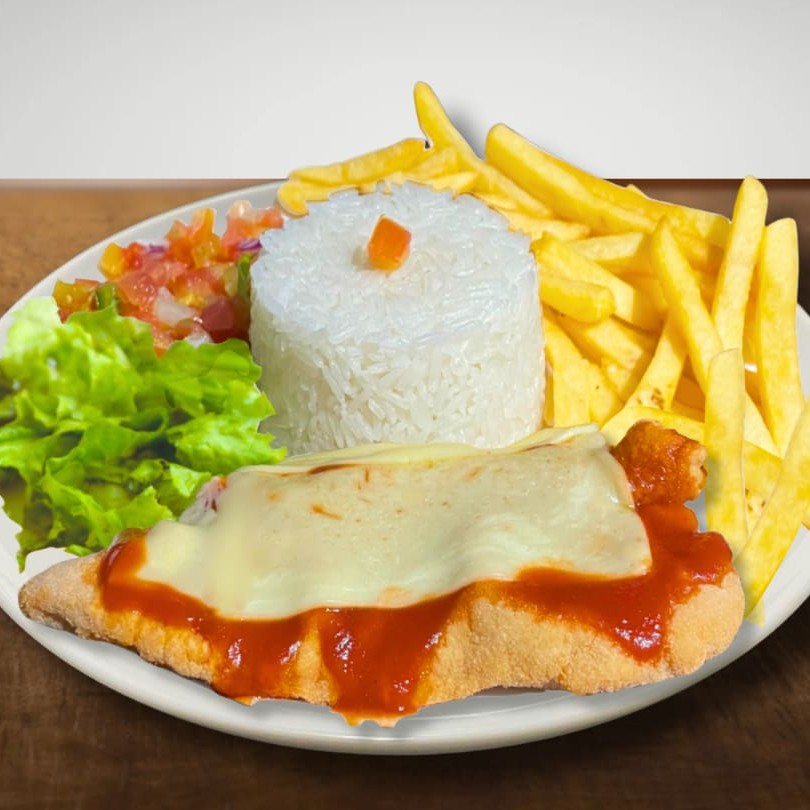 Delicioso Prato Executivo Feito com: -File de Frango empanado, com Molho e Mussarela -Arroz -Salada -Bastante Batata frita