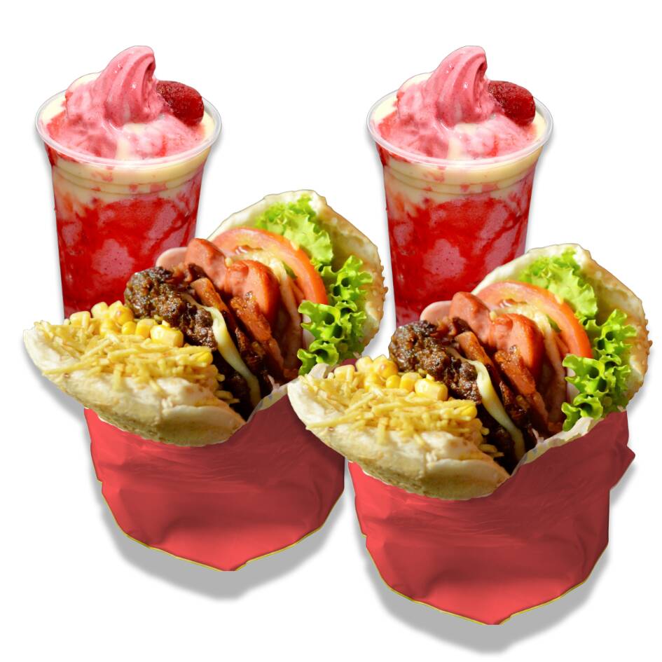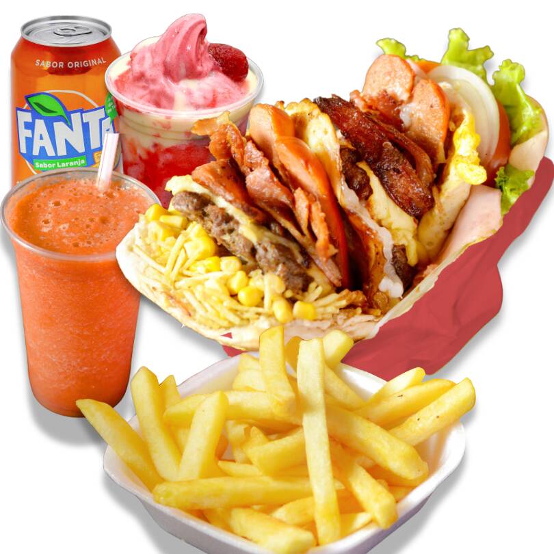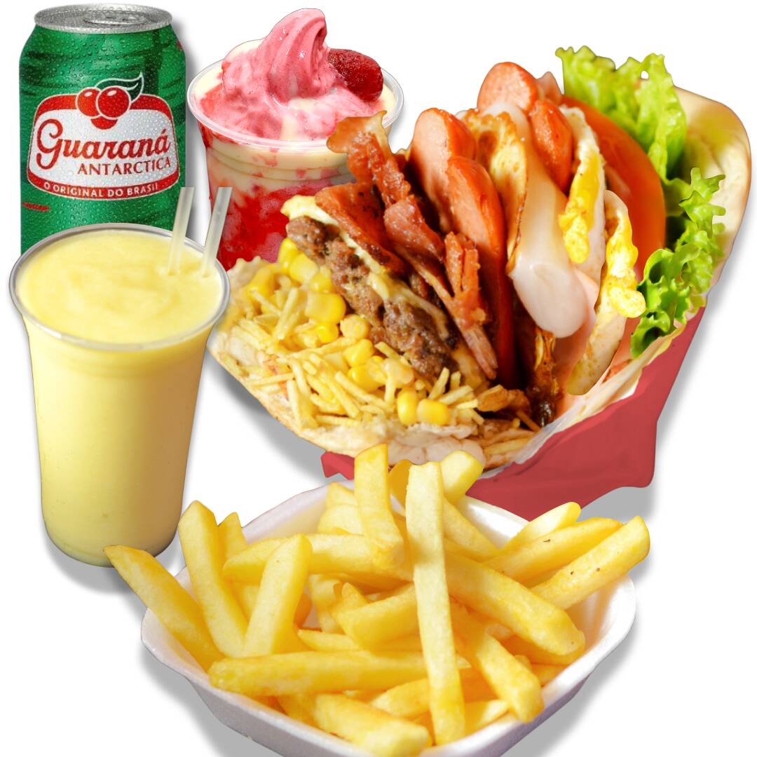 2 Sanduíches com: Pão Big, Hambúrguer Caseiro, Bacon, Salsicha, Mussarela, Ovo, Alface, tomate, Abacaxi, Milho e Batata. 2 Moraguet 300ml Sobremesa top Feita com Morangos selecionados Adicional de Leite condensado e cobertura sabor morango. 1 Batata 150g