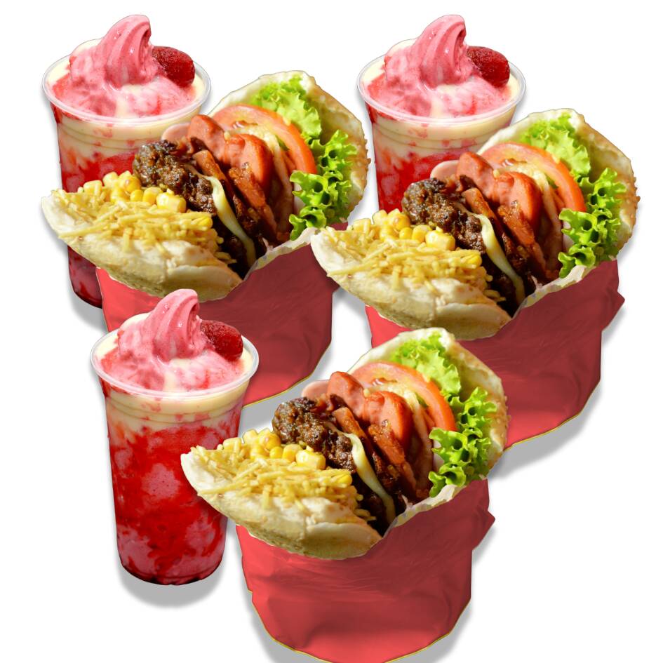 3 Sanduíches com: Pão Big, Hambúrguer Caseiro, Bacon, Salsicha, Mussarela, Ovo, Alface, Tomate, Milho e Batata. 3 Moraguet 300ml( sobremesa exclusiva, tipo o creme de morango, só que mais forte e mais gostoso, bem concentrado, feito com Morangos selecionados!)
