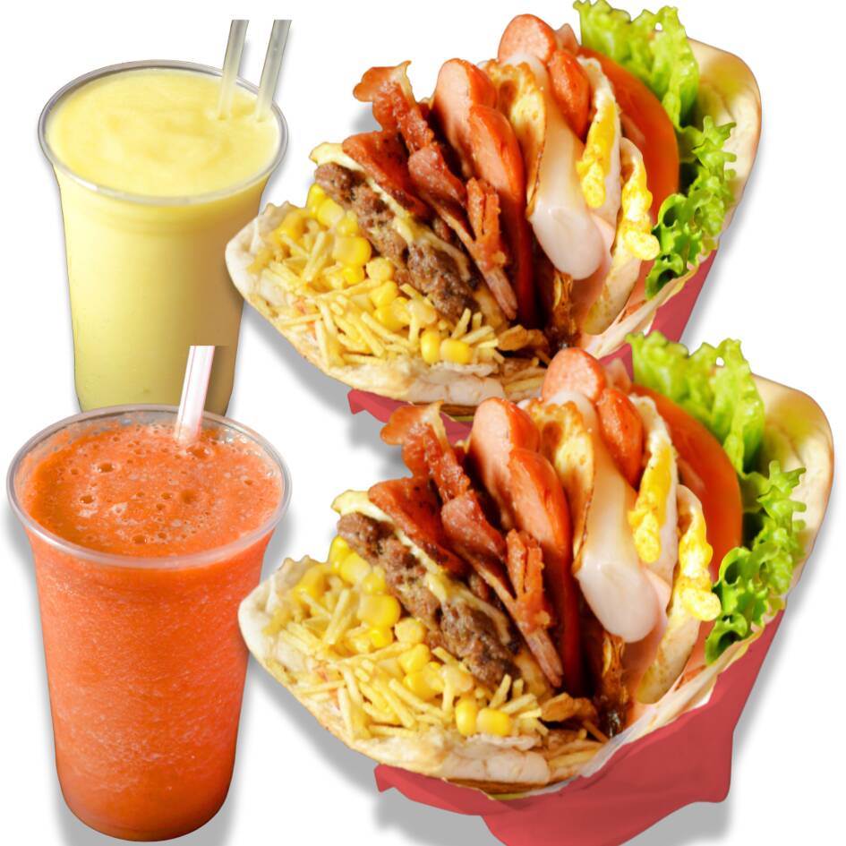 2 Sanduíches com: Pão Big, Hambúrguer Caseiro, Bacon, 2 Salsicha, 2 Ovo Mussarela,, Alface, Tomate, Abacaxi, Milho e Batata. + 2 Sucos à escolha Acerola ou Caju