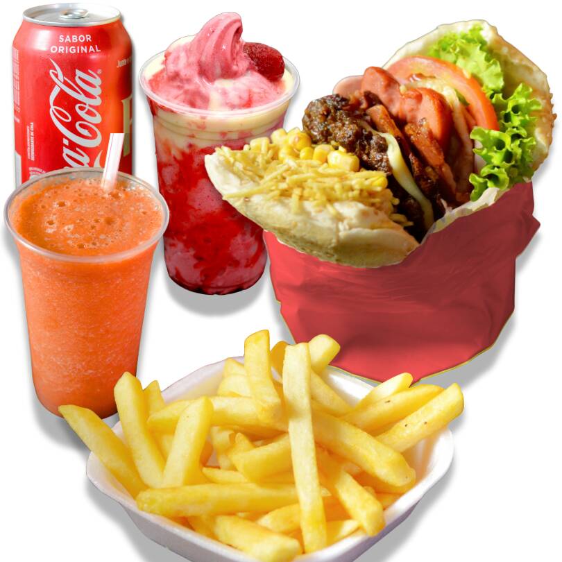Pão Big, escolha sua carne, Bacon, Salsicha, Ovo, Mussarela, Alface, tomate, Abacaxi, Milho e Batata. Escolha a sua Bebida e Batata!*meramente ilustrativa, vai apenas uma das bebidas acima