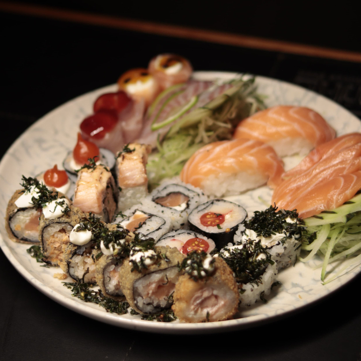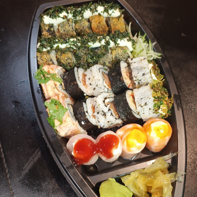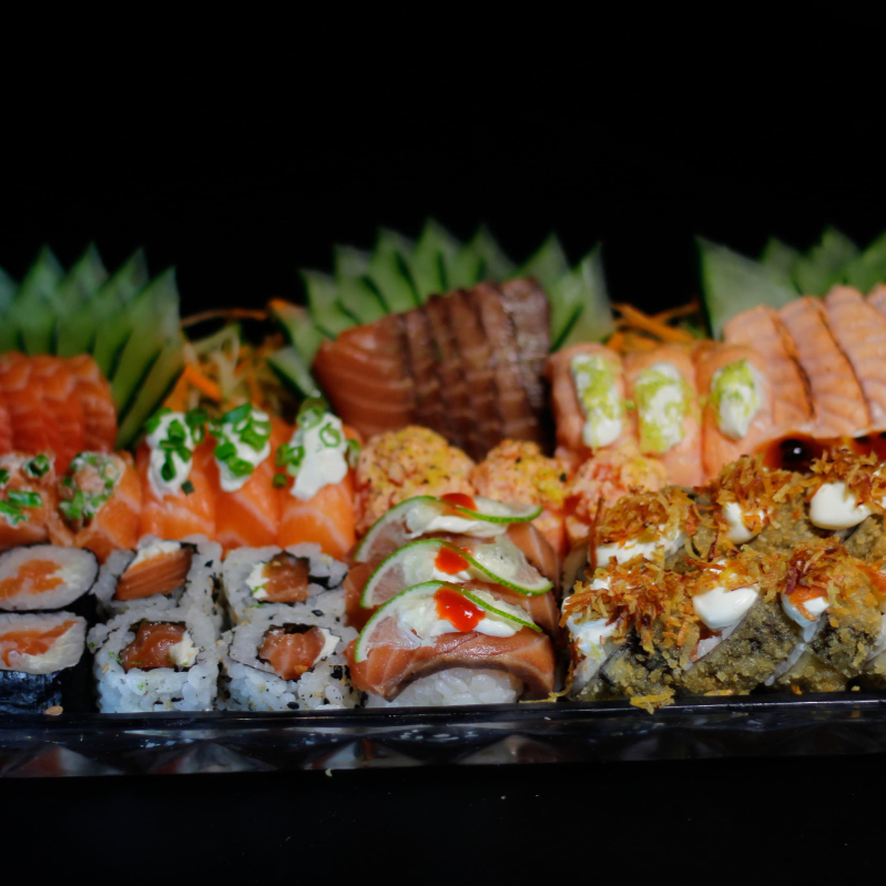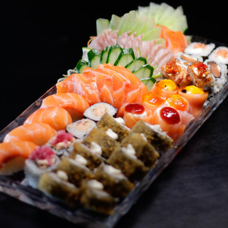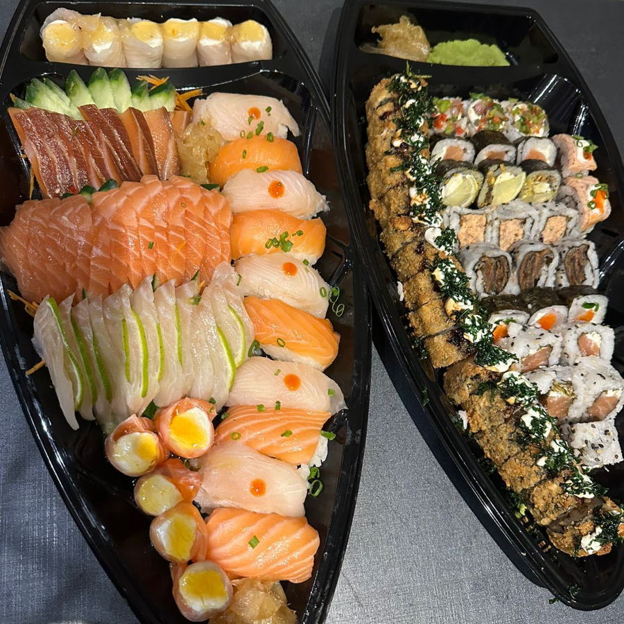10 Hot´s, 20 Sushis variados, 2 Gunkans Salmão geleia de maracujá, 2 Gunkans Tilapia geleia de Morango.