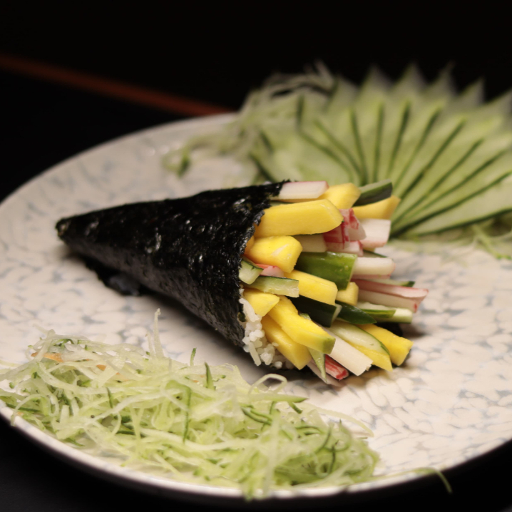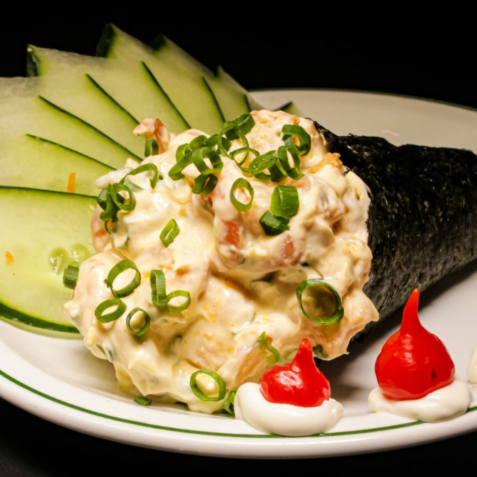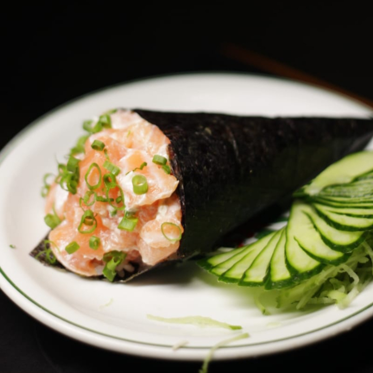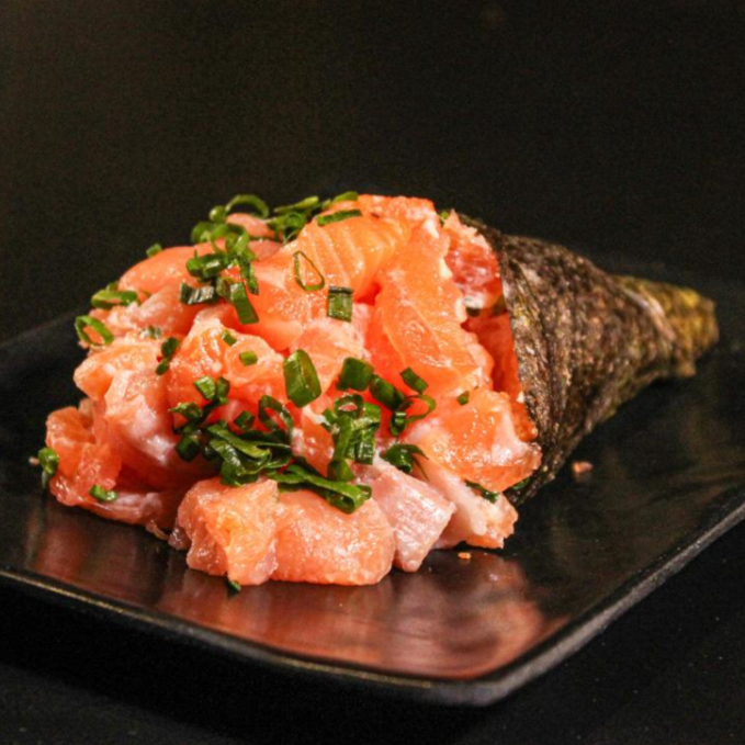 Temaki clássico com alga em cone, recheado com arroz e salmão batido ou em cubos. Sabor puro e fresco em cada mordida!