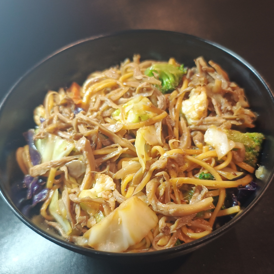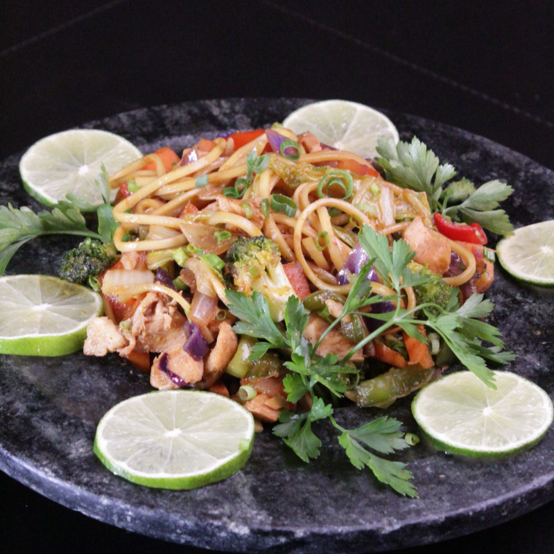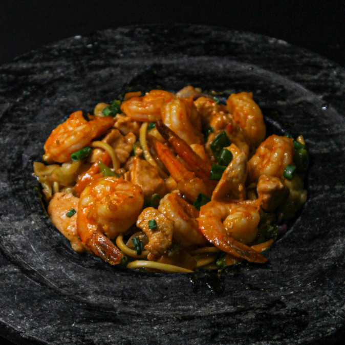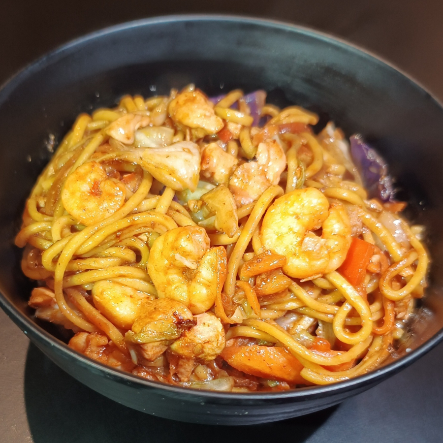 Espaguete à moda oriental com molho de soja, legumes e camarão grelhado. Uma combinação perfeita de sabor e textura!