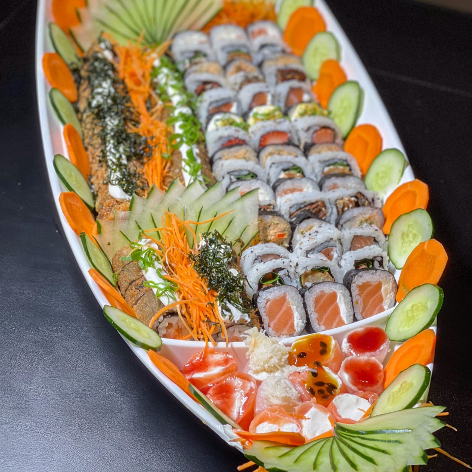 30 Hot´s Filadélfia, 50 Sushis variados, 2 Gunkns salmão Cream Cheese, 2 gunkans salmão geleia de maracujá, 2 gunkans salmão gelia de pimenta, 2 gunkans Tilapia Cream Cheese, 2 Gunkans tilapia e coco