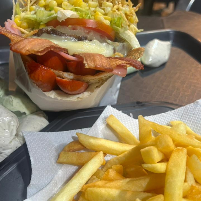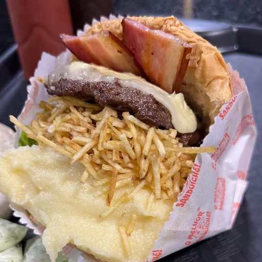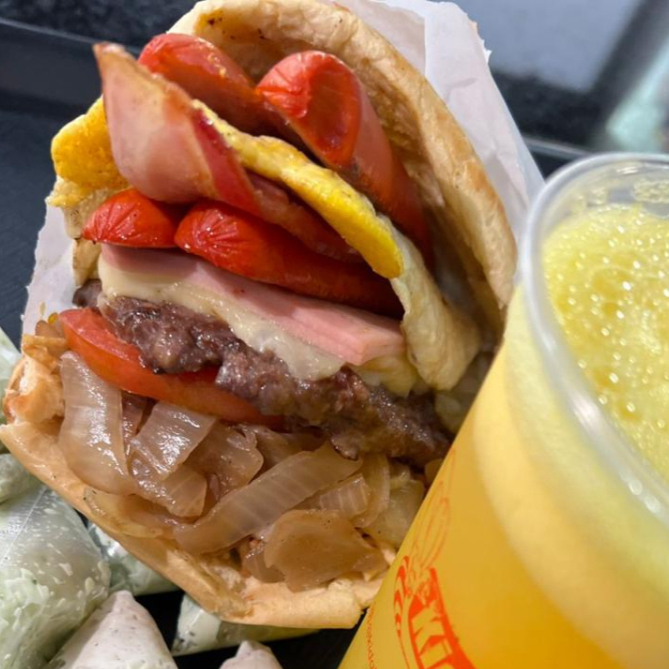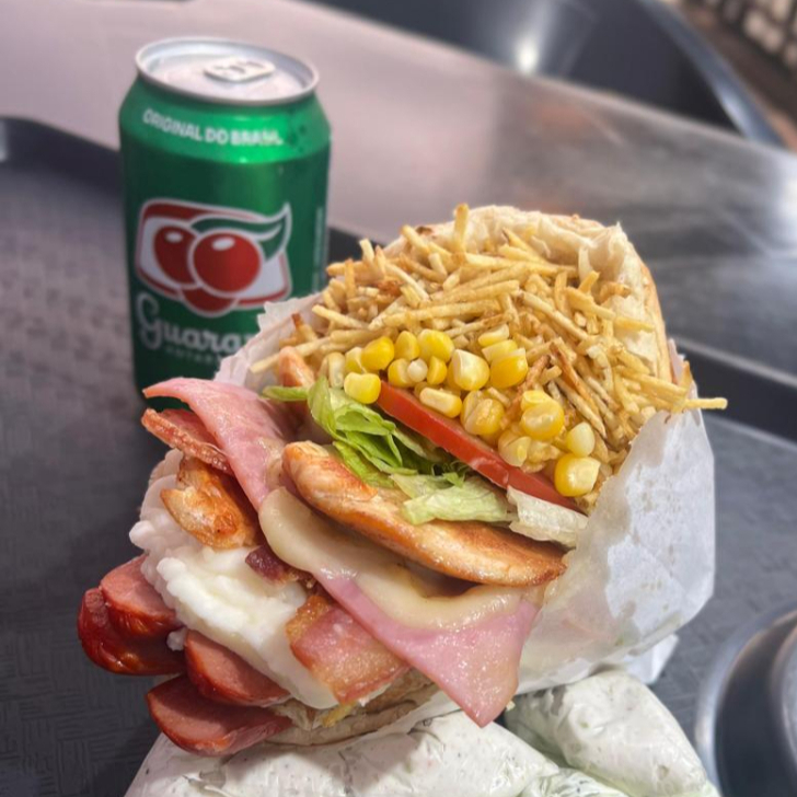 Pão , hambúrguer bovino, 1 carne (a escolha), queijo, bacon, ovo, 2 salsichas, presunto, alface e tomate.
