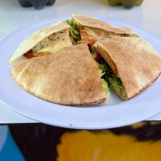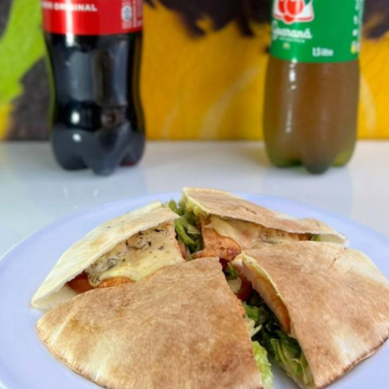 Pao sirio(carne a escolha) 4 queijos , oregano azeite alface e tomate + 1 refrigerante de 1,5.