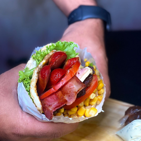 Pão, Hambúrguer, 1 carne (A esolha), Queijo, Bacon, Ovo, 2 Salsicha, Presunto e Salada
