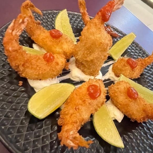 Camarão empanado e temperado na farinha Panko e fritos na hora .