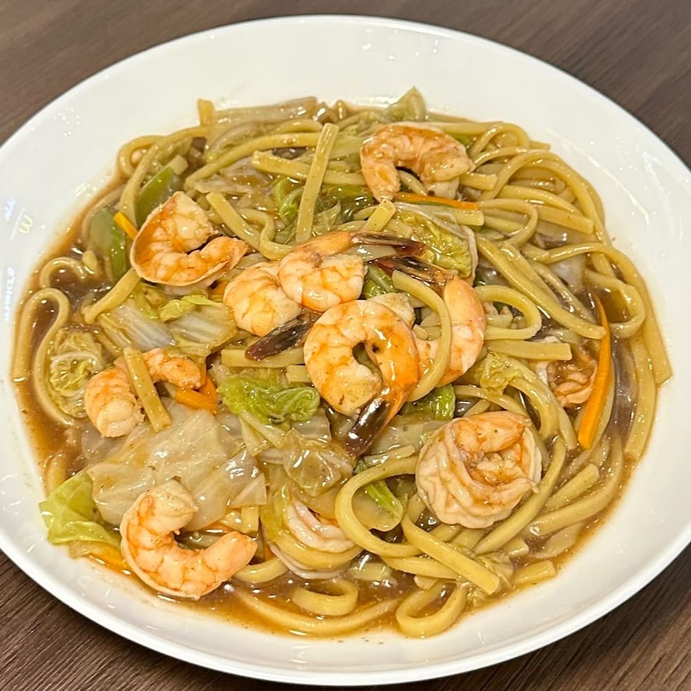 Delicioso yakisoba feito com legumes de primeira qualidade, nosso macarrão especial para yakisoba e suculentos camarões salteados.