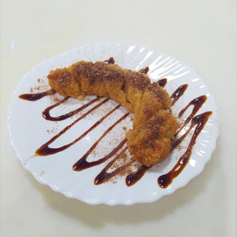 Deliciosa sobremesa de banana empanada e frita com cobertura de chocolate