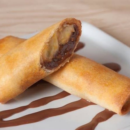 Deliciosa sobremesa feita com massa harumaki com recheio de banana e chocolate de avelã
