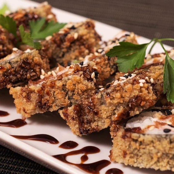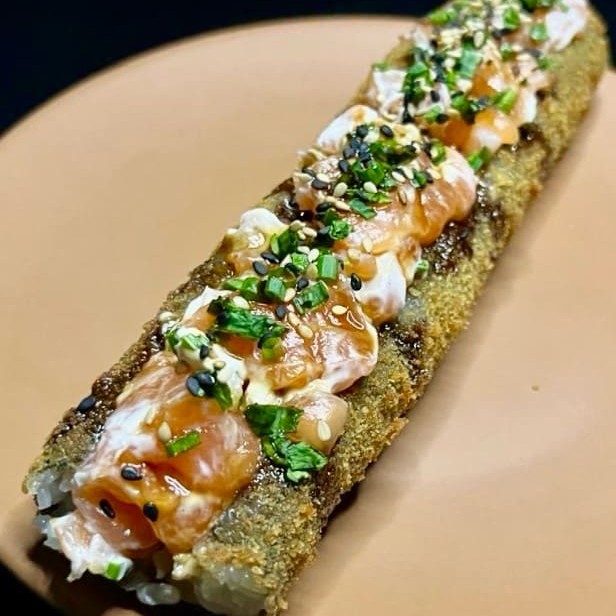 Delicioso hot Philadelphia recheado com salmão e cream cheese , empanados na farinha flocada e fritos. - Acompanha kit com hashis e molhos