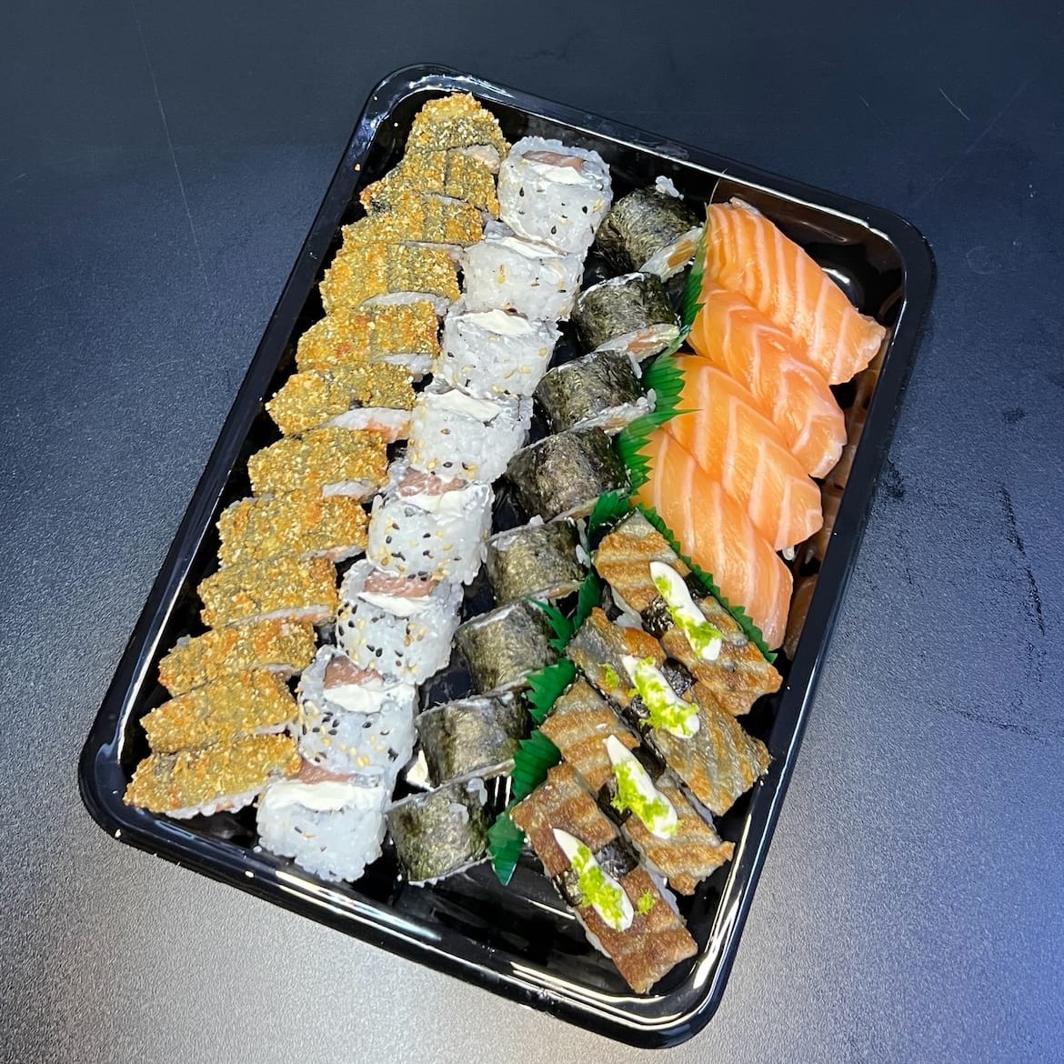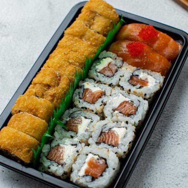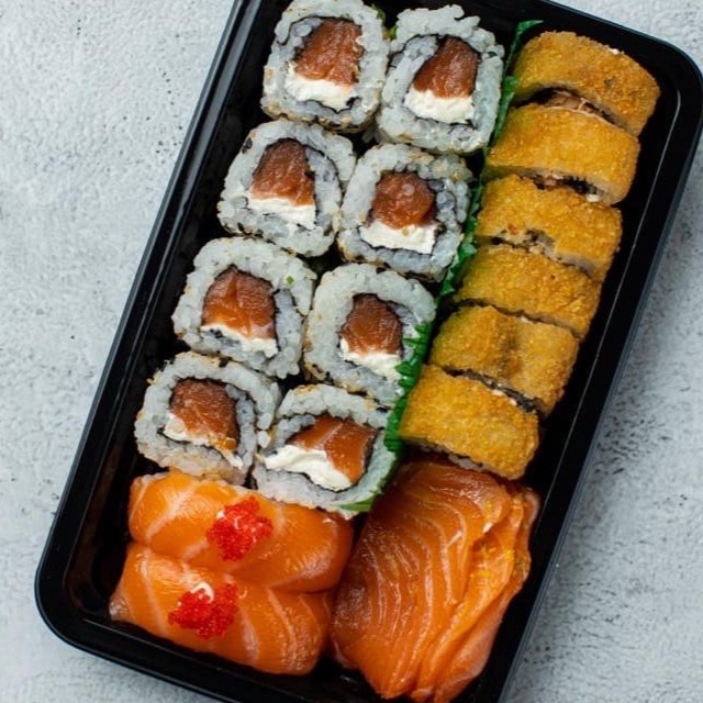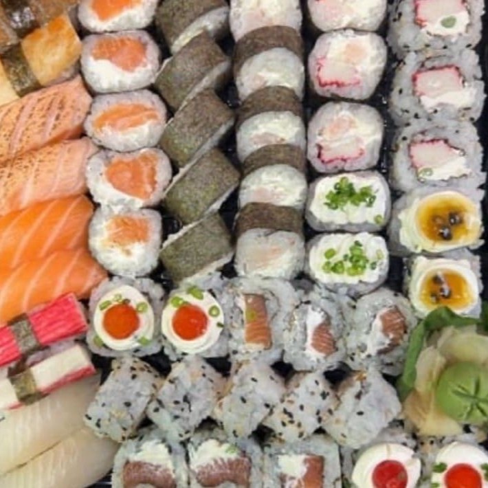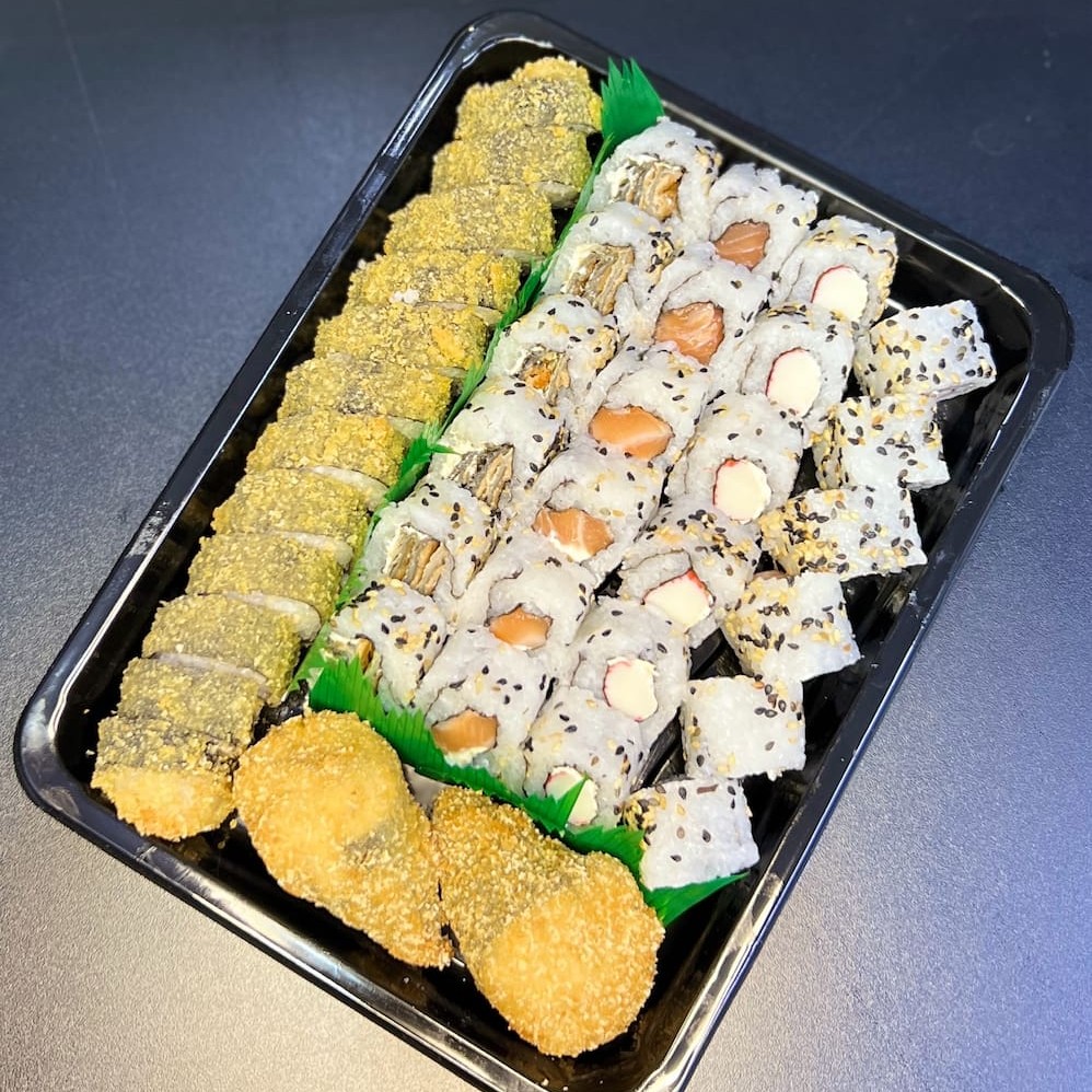 Esse combo especial é composto com os mais frescos pescados do Dia, inclui nele: 10 hossomaki de Kani 10 hossomaki de salmão 15 uramaki de salmão com cream cheese 05 uramaki de Kani com cream cheese 02 Niguiri de salmão flambado 02 Niguiri de salmão skin 02 Niguiri de peixe branco 02 Niguiri de salmão 02 Niguiri de Kani Acompanha 3 pares de hashi e 2 molhos shoyu 30ml.
