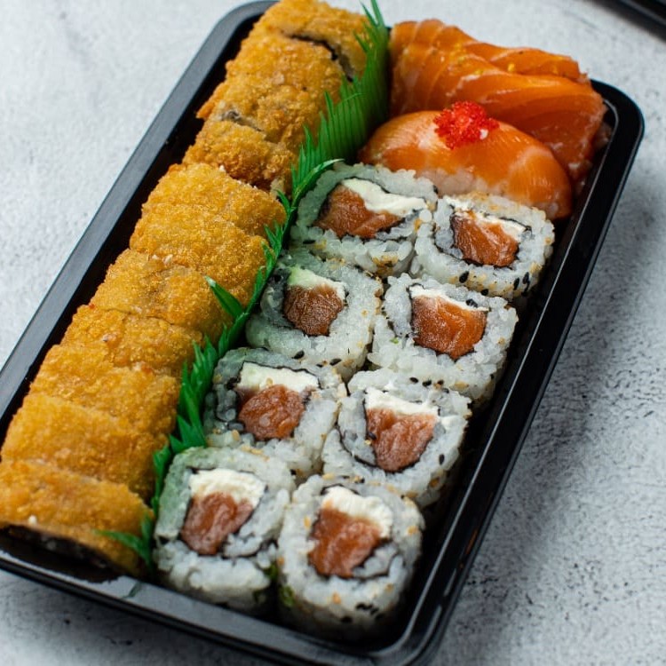 Delicioso combo composto por: 02 Niguiri de salmão 02 Niguiri de peixe branco 02 uramaki de Kani 02 uramaki de salmão 02 uramaki de patê 02 hossomaki de salmão 03 jyo 02 hot Philadelphia Acompanha 2 pares de hashi e 1 molho shoyu 30ml.