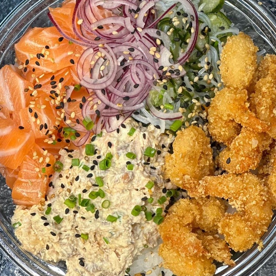 Delicioso Poke feito com: Arroz japonês 100g Salmão fresco 50g Patê grill 50g Sunomono 50g Camarão empanado 50g Cebola roxa e Gergelim Acompanha 1 hashi e 1 molho shoyu 30ml.