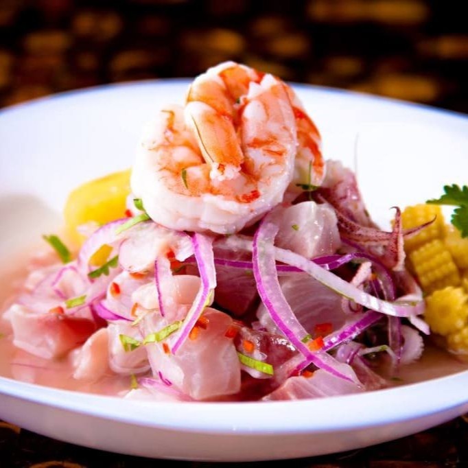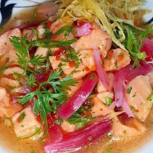 Delicioso e saboroso ceviche composto por: Fatias de tilápia ,camarões frescos, cebola roxa , pimenta dedo de moça , pimenta de cheiro , temperos orientais e suco do limão .