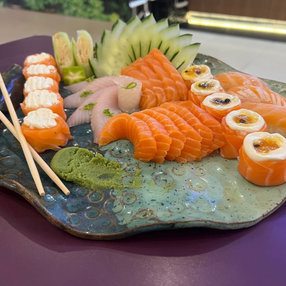 Acompanha 10 sashimi de salmão 04 sashimi de peixe branco 05 jyo salmão com cream cheese 05 jyo salmão com calda de maracujá 03 Niguiri de salmao Acompanha 2 pares de hashi e 1 molho shoyu 30ml.