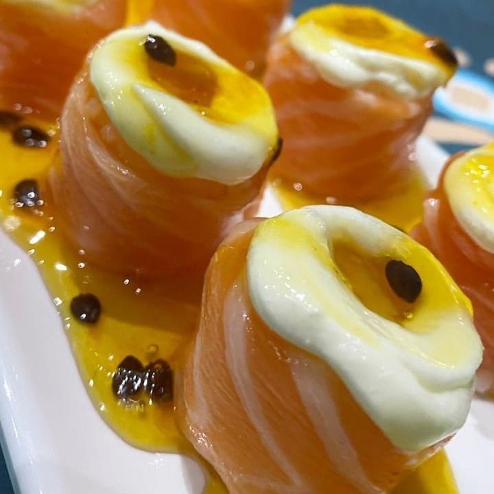 Gunkan - rolinho de salmão recheado , cobertura de cream cheese.