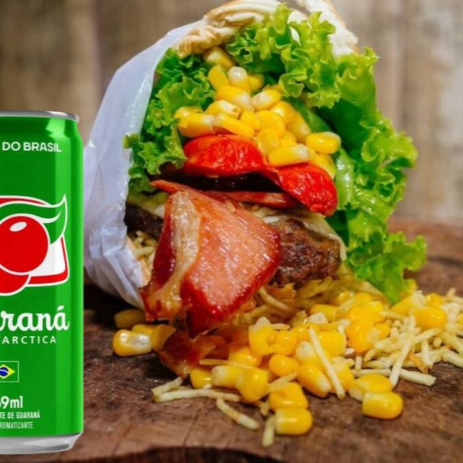 Hambúrguer suculento com queijo, bacon, ovo, salsicha, alface, tomate, milho e batata palha. Acompanhado do refrescante Guaraná Antarctica!