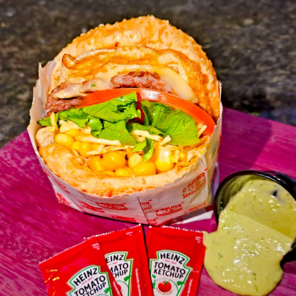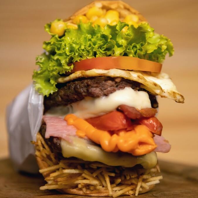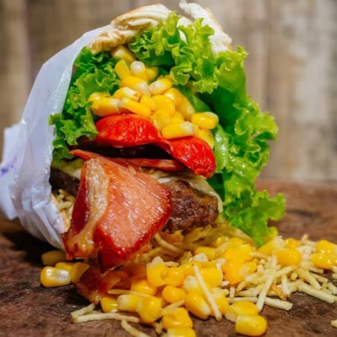 Hambúrguer à sua escolha com queijo, ovo, alface, tomate, milho e batata palha. Uma explosão de sabores em cada mordida!