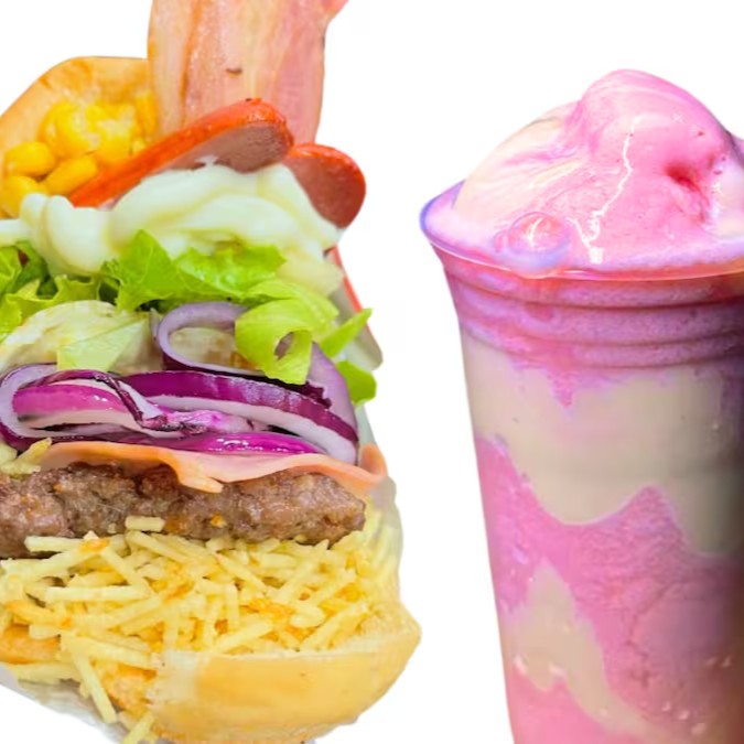 Hambúrguer suculento com queijo, bacon crocante, ovo, salsicha, alface, tomate, milho e batata palha. Sabores irresistíveis em cada mordida!