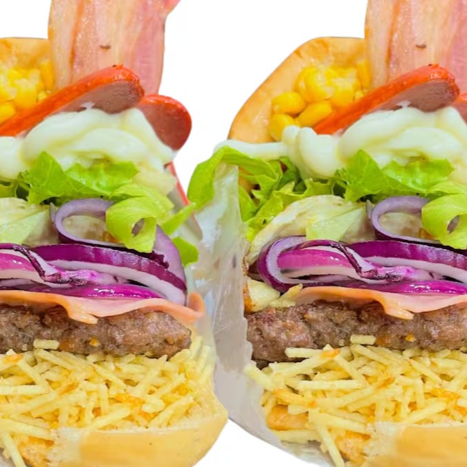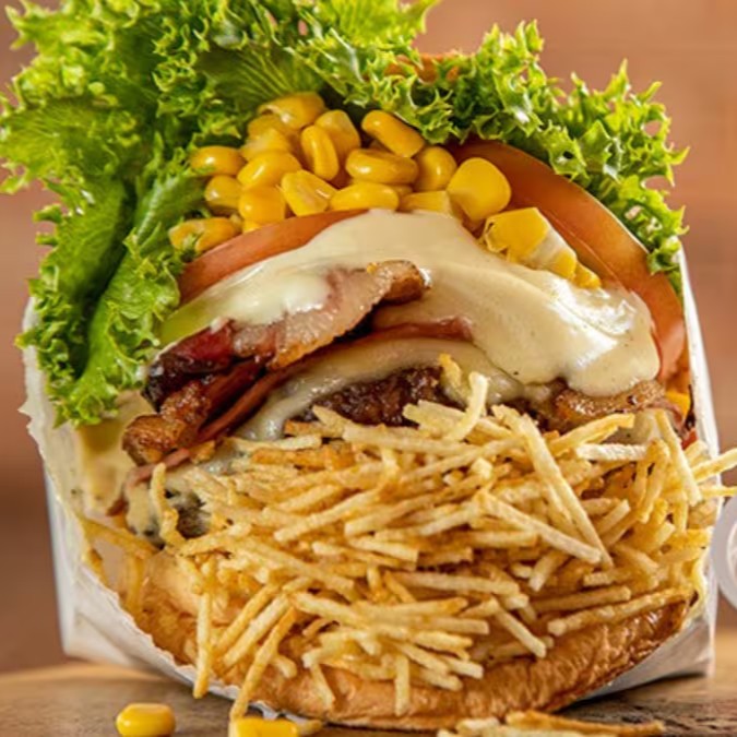 Hambúrguer à sua escolha com queijo, cheddar cremoso, ovo, alface, tomate, milho e batata palha. Sabores intensos e irresistíveis em cada mordida!