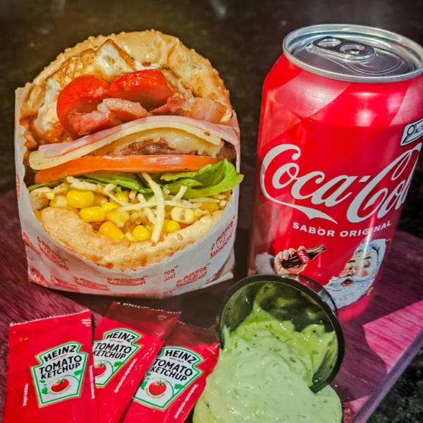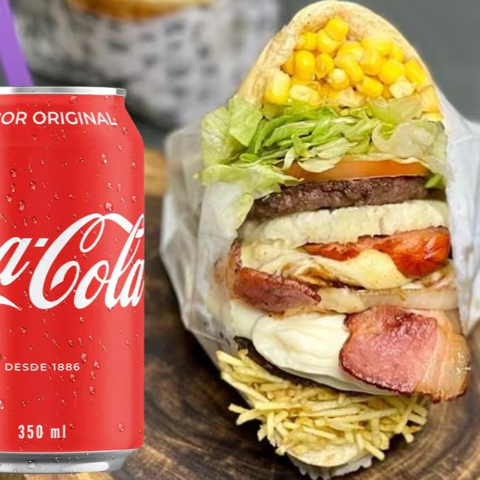 Hambúrguer, queijo, bacon, ovo, salsicha, alface, tomate, milho e batata palha, acompanhado de uma refrescante Coca-Cola!