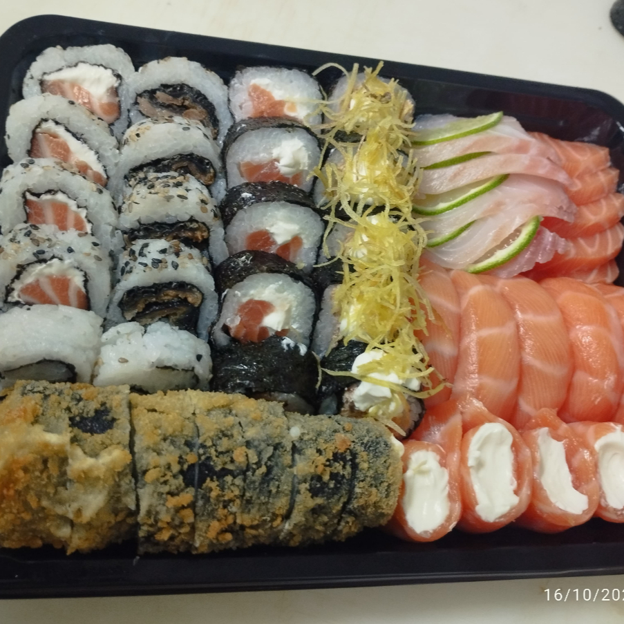 10 sashimi 05 hot 5 gunkan se salmon 5 niguiri de salmon 15= sushi variado