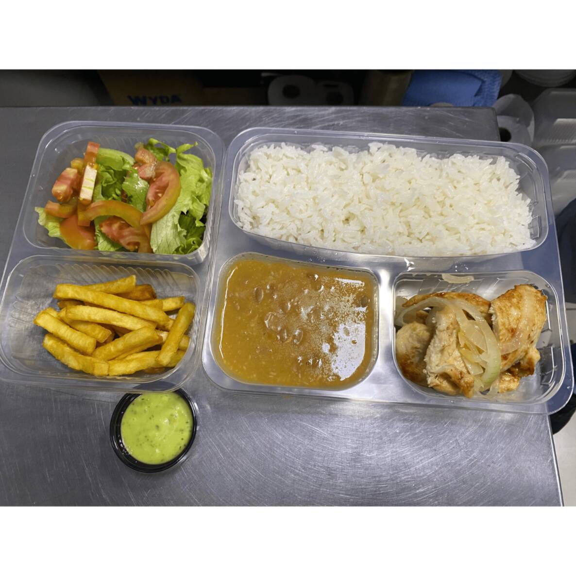 Arroz Branco, Feijão de Caldo, Salada, Batata Frita e 150gr de Frango ou Bife