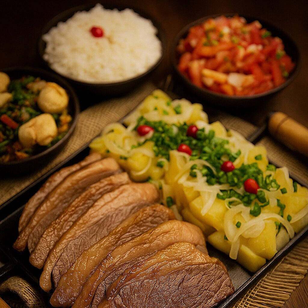 Deliciosa Picanha na Chapa (600g) com Mandioca acompanha Arroz, Feijão e Vinagrete - Serve Bem 2 a 3 Pessoas