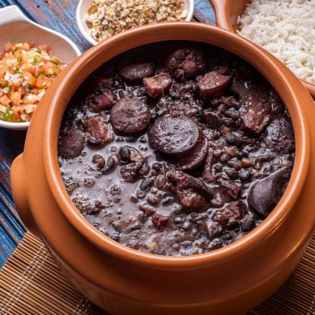 Arroz Branco, Feijoada, Farofa, Colve, Laranja, Vinagrete Tropical(tomate,abacaxi,cebola roxa, salsa)
