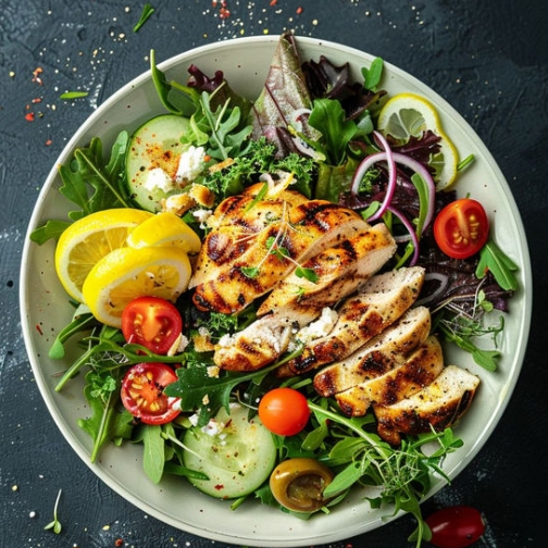 Mix verde, frango grelhado, ovo cozido sunomo batata doce cozida e selada na chapa tomate cereja, manga especial