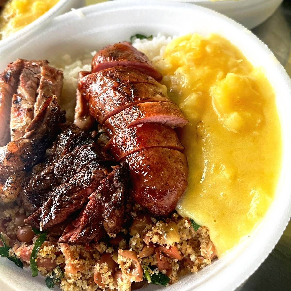 * Arroz Branco * Feijão de Tropeiro *Mandioca Amanteigada Salada * Alface * Vinagrete *Churrasco: Alcatra / Lombo / Linguiça de Frango